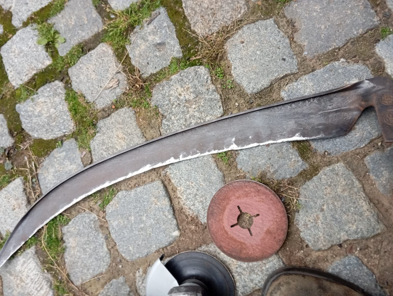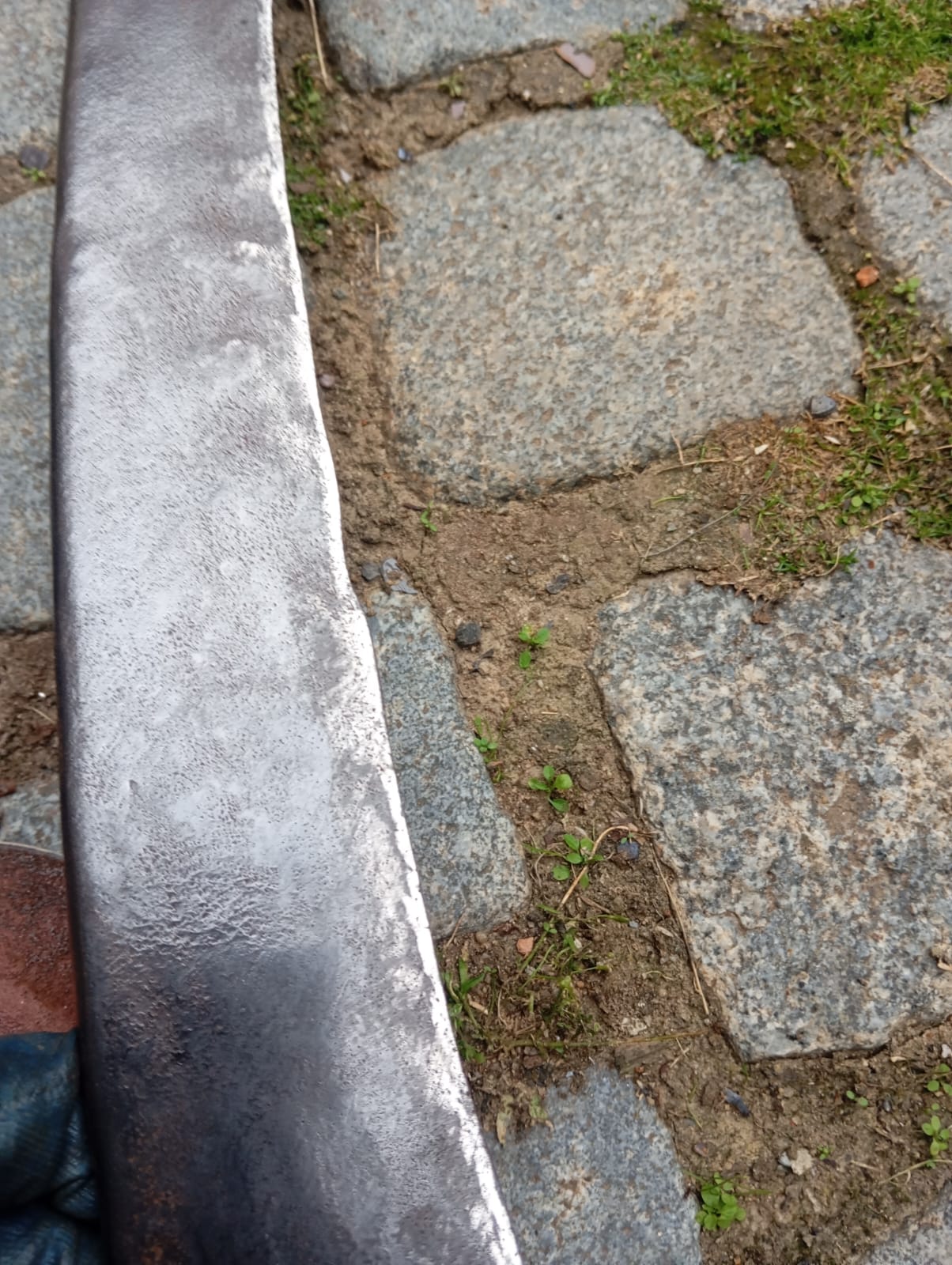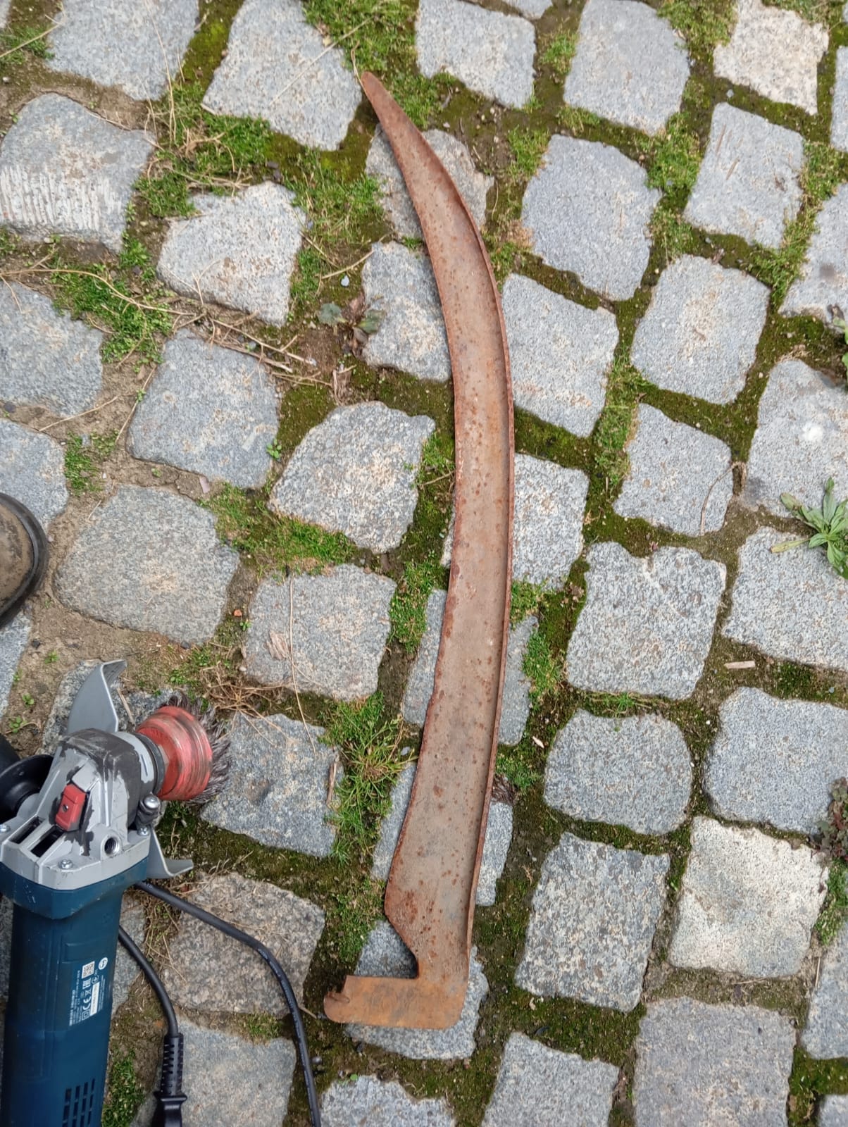 Po okartáčování byla vidět bodová koroze, všechny důlky co jsou poblíž ostří se musí odbrousit, protože by mohly způsobovat roztržení ostří při kutí kosy. Zde byl schválně použitý starý opotřebovaný smirkový/fíbrový výsek. Má velmi malý úběr, šlo tak snadno kontrolovat obroušení, aniž bych během okamžiku zničil kosu, ale pozor na vyhřátí. (Kov se nesmí ohřát na více než cca 200°c > jednodušeji, nesmí se začít barvit.)