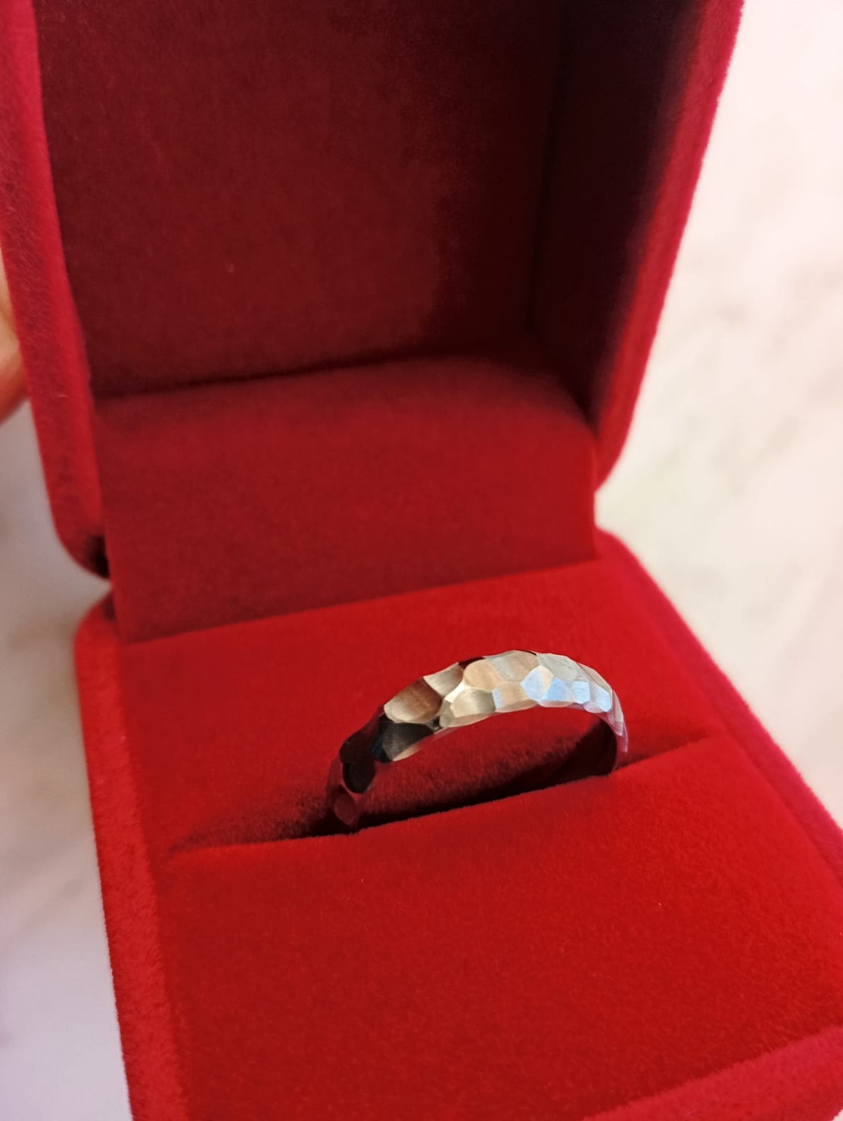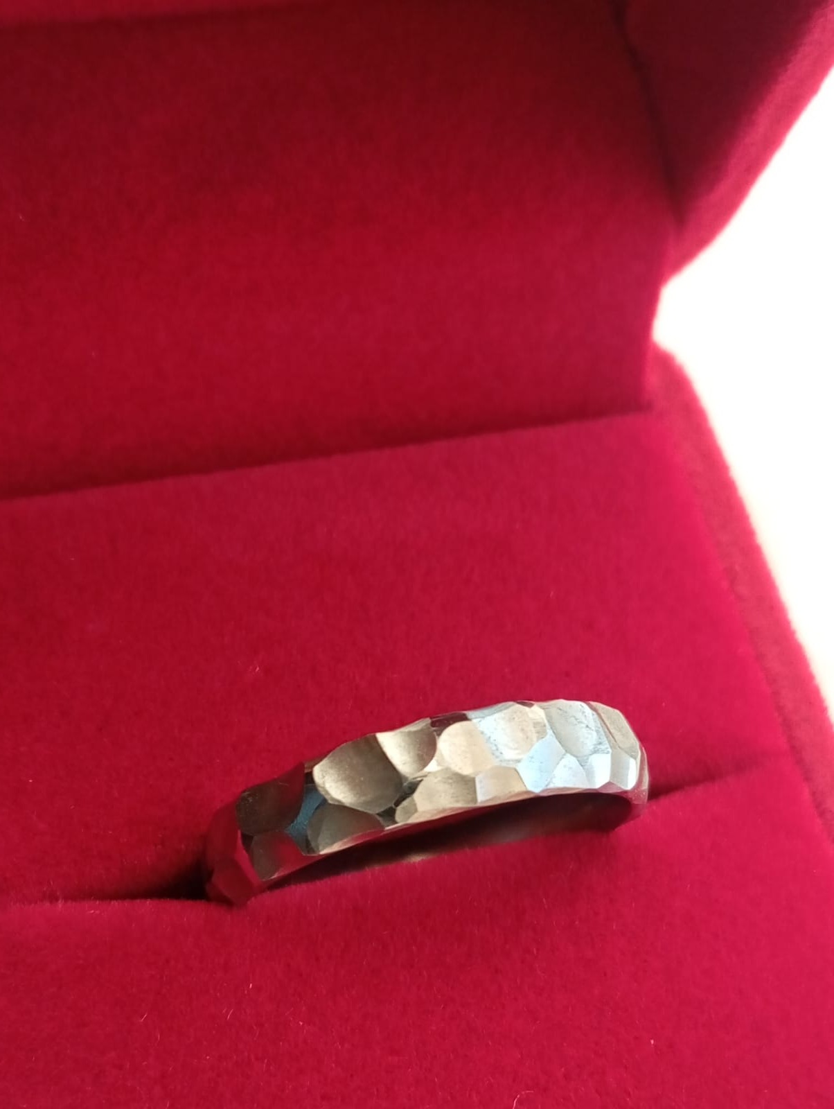 Tento titanový prsten je díky nepravidelným vroubkům ještě blíže struktuře štípaného kamene, pazourku nebo obsidiánu.
