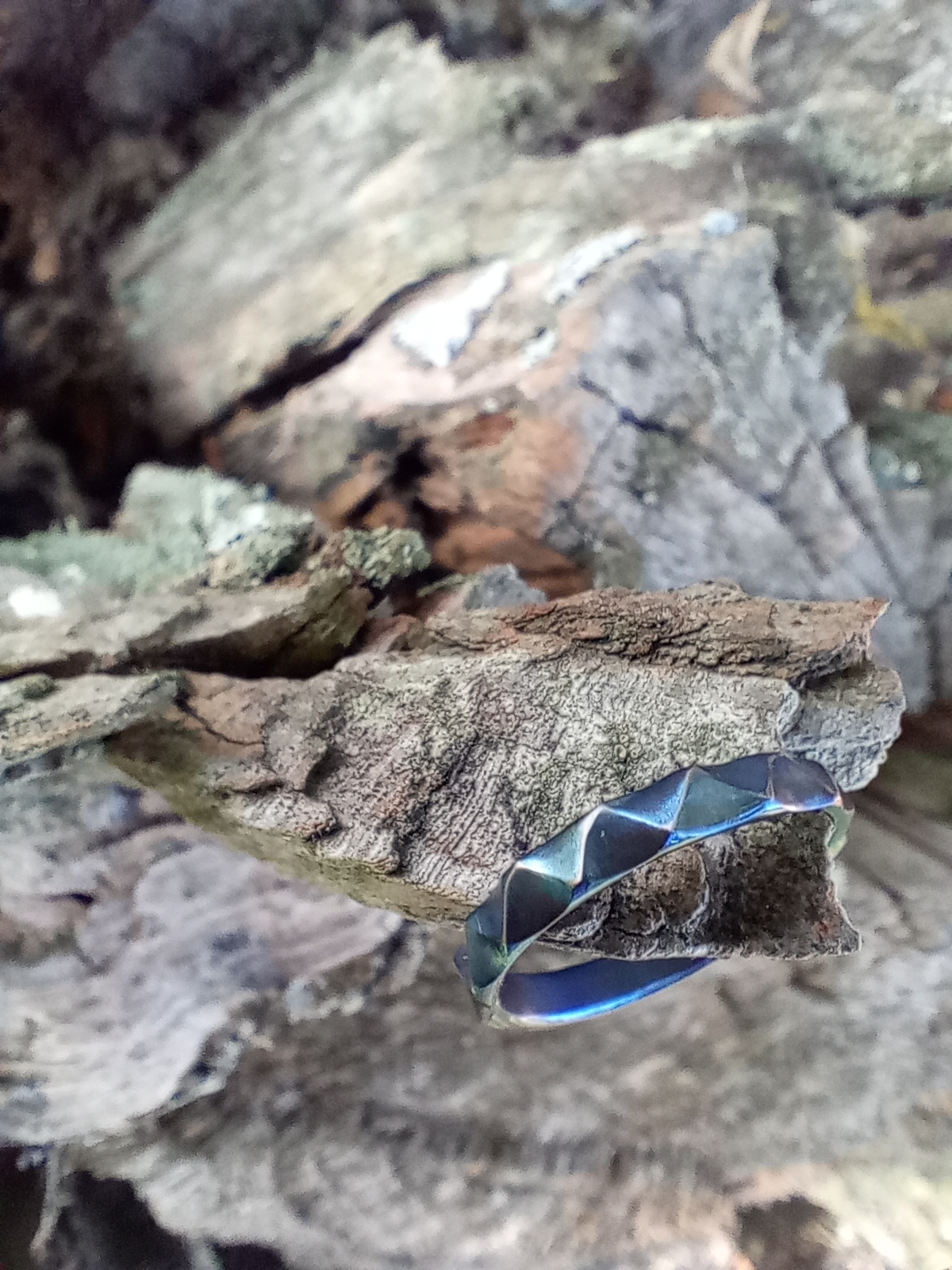 Pravidelná struktura v motivu "obsidián" která připomíná pravidelně štípaný pazourek nebo obsidián, je sama osobě velmi působivým motivem, ale při zbarvení plamenem poutá ještě více pozornosti.