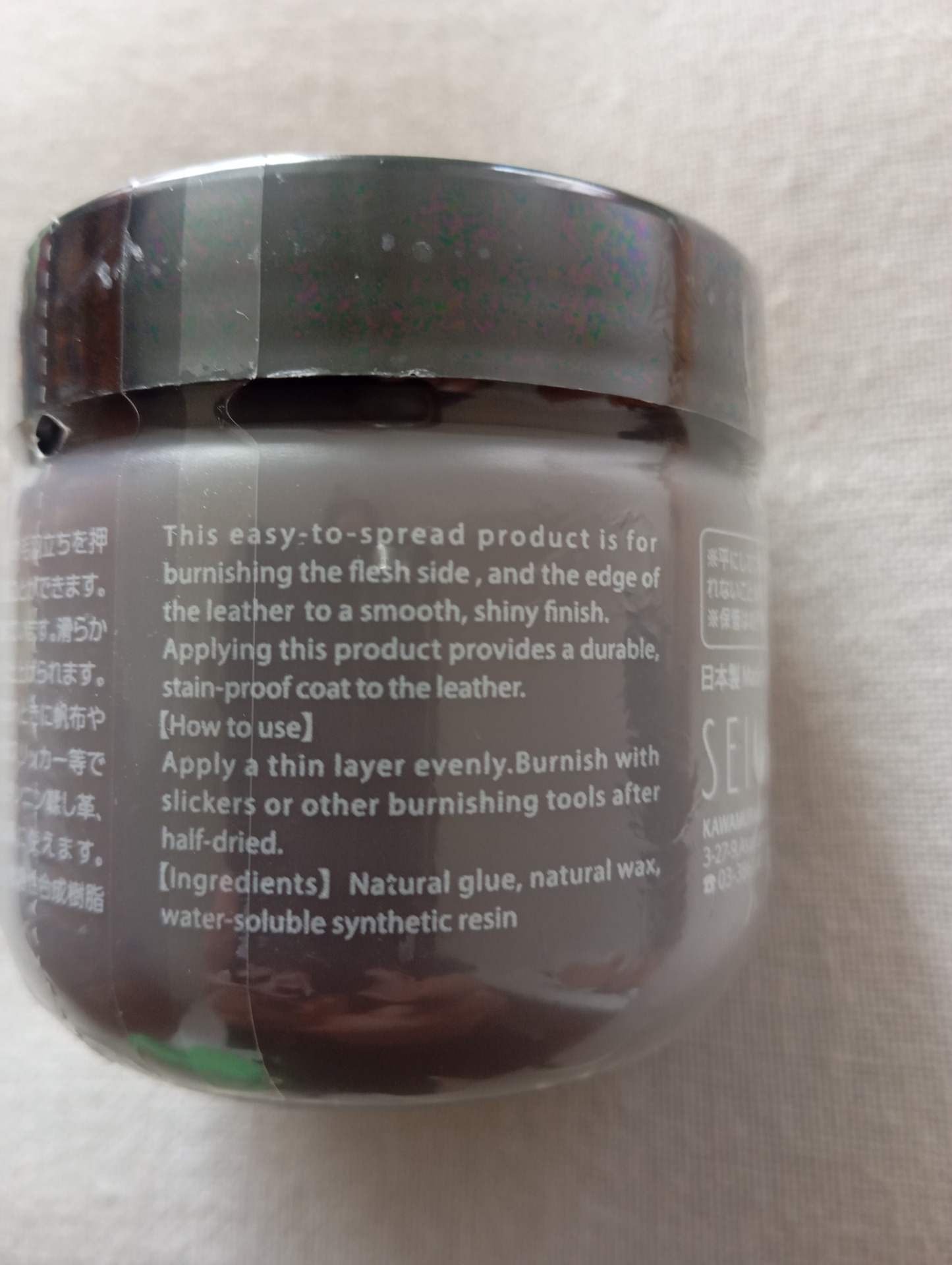 originál SEIWA, japonská směs vosků Tokonole, perfektrní nástroj na barevnou nebo přírodní (nebarvenou) kůži, hrana se krásně zaleští a zatáhne. Rozhodně doporučuji, pokud budete pracovat s černou kůží, hrana krásně splyne s lícovou kůže protože materiál kuže sice bude probarvený ale bude trochu do šeda po aplikaci černého Tokonole bude hrana lesklá a černá. (při použití čirého Tokonole hrana bude mít trošku světlejší odstín)